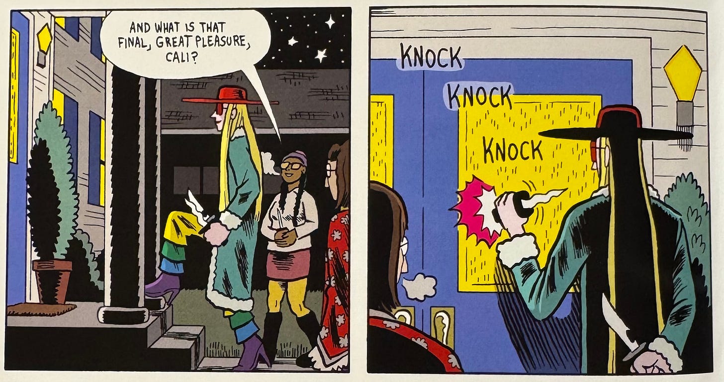 Credit to the great Tegan O’Neil, who I saw mention Panosian as “morphing into Jack Davis”, which I think is a good call, but I see more Drucker there. It may just be that Davis’s people tend toward long and lanky, while Panosian’s have a weightlifter’s thickness to them. It’s also because Panosian clearly draws from classic actors as models, which Davis did mostly with open rendering and clean lines, while Drucker always loved that feathered brush look.